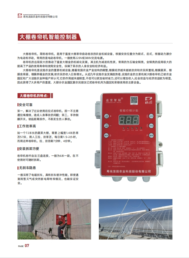 寿光龙田农业科技股份有限公司于2014年创立于“蔬菜之乡”----山东寿光。公司立志用科技服务三农,以帮助农业企业和个人提高农业生产率,协助农业企业和个人生产健康安全的高品质农产品为使命。践行“自强不息,厚德载物”的企业理念,专注于设施农业装备研发,研发生产了“温室智脑”智慧农业物联网系统、大棚智能放风机,“龙抬头”大棚运输车,“春暖花开”红外反射大棚保温被,大棚卷帘机等系列产品。公司于2017年在齐鲁股权交易中心挂牌上市,股票代码302505。 公司拥有注册商标12个,实用新型专利18项,外观专利4项,并获得了ISO9001质量管理体系认证证书,2021-2023年科技型中小企业称号。温室智脑大棚放风机,获得2020年度农业农村部举办的创新比赛优秀奖。 2022年,中央网信办、农业农村部、国家发展改革委、工业和信息化部、国家乡村振兴局联合印发的《2022年数字乡村发展工作要点》又进一步细化了智慧农业在2022年的重点任务,龙田农科将抓住历史机遇,打造智能化的系列装备,让农业生产更高效,更智能。